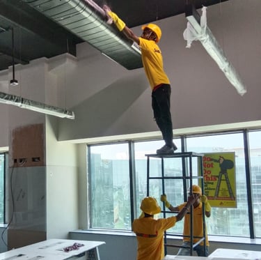We provide a professional High Level Dusting and Cleaning Services for exposed ducting, vents, false ceilings, skylight sheeting and rafters commonly found in modern, commercial architecture. For this particular cleaning contract our teams were tasked with cleaning the internal, false ceiling installed as a product quality control measure. This client runs a commercial printing business and their property features an internal ceiling over each office and printing station to ensure dust and floating contaminants are contained away from the final product.